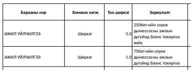 утас: "Таван толгой түлш” ХХК нь хүснэгтэд заасан бараа, ажил, үйлчилгээг нийлүүлэх хүсэлтэй аж ахуй нэгж байгууллагуудын хамтран ажиллах саналыг доор заасан хугацаанд нээлттэй хүлээн авч байна. Та бүхэн дараах бараа, ажил үйлчилгээний мэдээлэлтэй танилцана уу.
