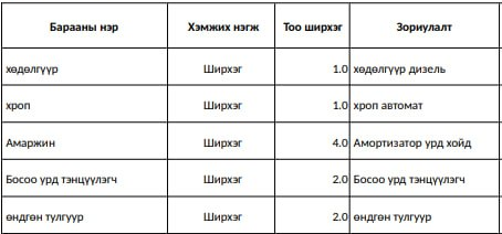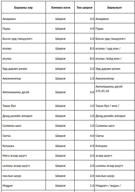 утас: "Таван толгой түлш” ХХК нь хүснэгтэд заасан бараа, ажил, үйлчилгээг нийлүүлэх хүсэлтэй аж ахуй нэгж байгууллагуудын хамтран ажиллах саналыг доор заасан хугацаанд нээлттэй хүлээн авч байна. Та бүхэн дараах бараа, ажил үйлчилгээний мэдээлэлтэй танилцана уу.