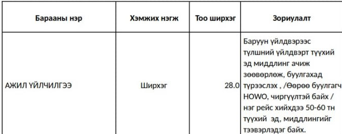 утас: "Таван толгой түлш” ХХК нь хүснэгтэд заасан бараа, ажил, үйлчилгээг нийлүүлэх хүсэлтэй аж ахуй нэгж байгууллагуудын хамтран ажиллах саналыг доор заасан хугацаанд нээлттэй хүлээн авч байна. Та бүхэн дараах бараа, ажил үйлчилгээний мэдээлэлтэй танилцана уу.
