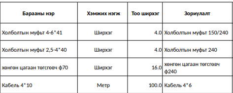 утас: "Таван толгой түлш” ХХК нь хүснэгтэд заасан бараа, ажил, үйлчилгээг нийлүүлэх хүсэлтэй аж ахуй нэгж байгууллагуудын хамтран ажиллах саналыг доор заасан хугацаанд нээлттэй хүлээн авч байна. Та бүхэн дараах бараа, ажил үйлчилгээний мэдээлэлтэй танилцана уу.