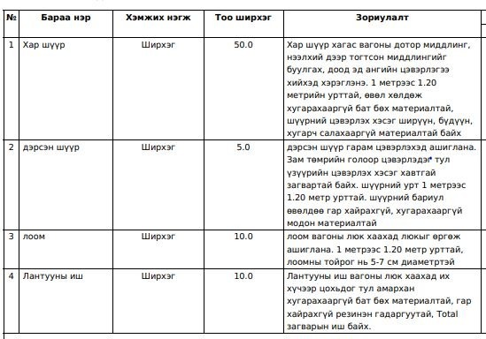 утас: "Таван толгой түлш” ХХК нь хүснэгтэд заасан бараа, ажил, үйлчилгээг нийлүүлэх хүсэлтэй аж ахуй нэгж байгууллагуудын хамтран ажиллах саналыг доор заасан хугацаанд нээлттэй хүлээн авч байна. Та бүхэн дараах бараа, ажил үйлчилгээний мэдээлэлтэй танилцана уу.