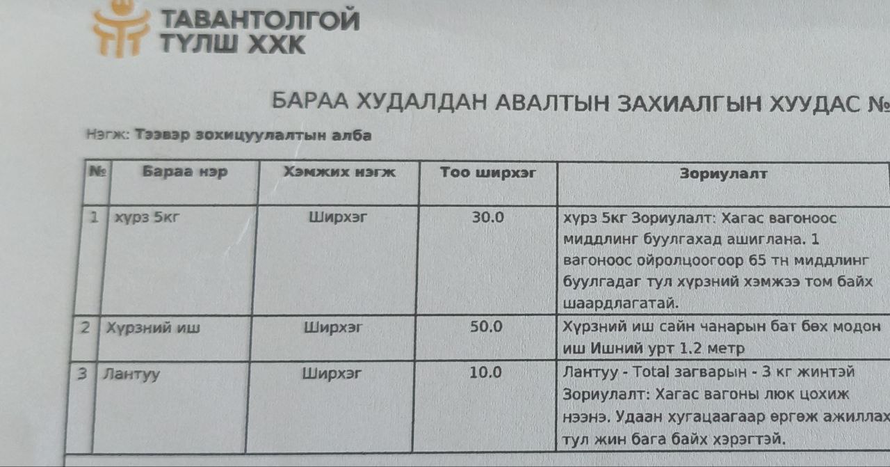 утас: "Таван толгой түлш” ХХК нь хүснэгтэд заасан бараа, ажил, үйлчилгээг нийлүүлэх хүсэлтэй аж ахуй нэгж байгууллагуудын хамтран ажиллах саналыг доор заасан хугацаанд нээлттэй хүлээн авч байна. Та бүхэн дараах бараа, ажил үйлчилгээний мэдээлэлтэй танилцана уу.