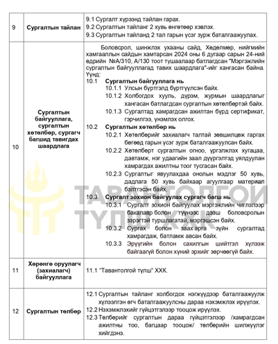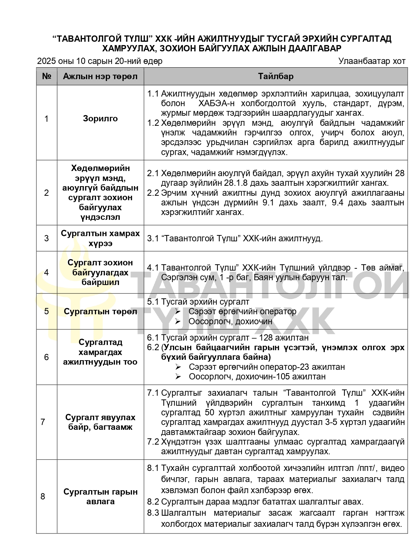 "Тавантолгой түлш” ХХК нь хүснэгтэд заасан бараа, ажил, үйлчилгээг нийлүүлэх хүсэлтэй аж ахуй нэгж байгууллагуудын хамтран ажиллах саналыг 3 хоногийн хугацаанд нээлттэй хүлээн авч байна. Та бүхэн дараах бараа, ажил үйлчилгээний мэдээлэлтэй танилцаж, үнийн санал, компанийн танилцуулга болон холбогдох материалаа илгээхийг урьж байна.
