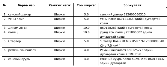 утас: "Таван толгой түлш” ХХК нь хүснэгтэд заасан бараа, ажил, үйлчилгээг нийлүүлэх хүсэлтэй аж ахуй нэгж байгууллагуудын хамтран ажиллах саналыг доор заасан хугацаанд нээлттэй хүлээн авч байна. Та бүхэн дараах бараа, ажил үйлчилгээний мэдээлэлтэй танилцана уу.