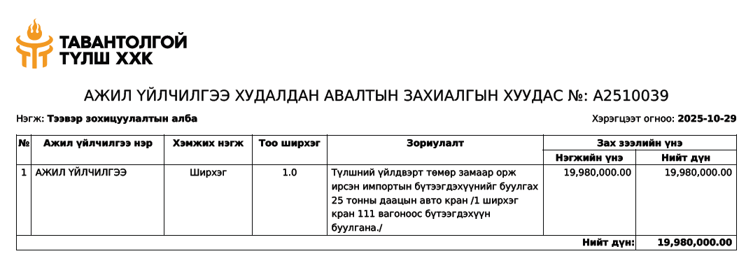 "Тавантолгой түлш” ХХК нь Түлшний үйлдвэрт төмөр замаар орж ирсэн импортын бүтээгдэхүүн буулгах 25 тн даацтай автокран түрээсийн үйлчлгээний үнийн санал ирүүлэхийг урьж байна.