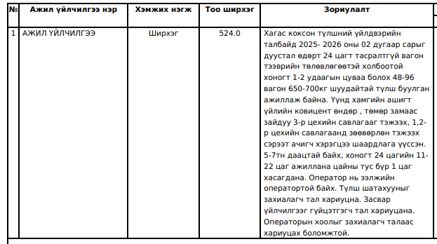 "Таван толгой түлш” ХХК нь хүснэгтэд заасан бараа, ажил, үйлчилгээг нийлүүлэх хүсэлтэй аж ахуй нэгж байгууллагуудын хамтран ажиллах саналыг доор заасан хугацаанд нээлттэй хүлээн авч байна. Та бүхэн дараах бараа, ажил үйлчилгээний мэдээлэлтэй танилцана уу.
