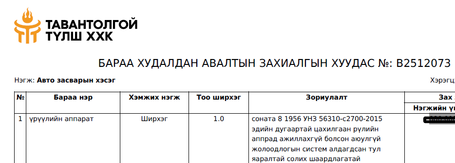 "Тавантолгой түлш” ХХК нь хүснэгтэд заасан бараа, ажил, үйлчилгээг нийлүүлэх хүсэлтэй аж ахуй нэгж байгууллагуудын хамтран ажиллах саналыг 3 хоногийн хугацаанд нээлттэй хүлээн авч байна. Та бүхэн дараах бараа, ажил үйлчилгээний мэдээлэлтэй танилцаж, үнийн санал, компанийн танилцуулга болон холбогдох материалаа илгээхийг урьж байна.