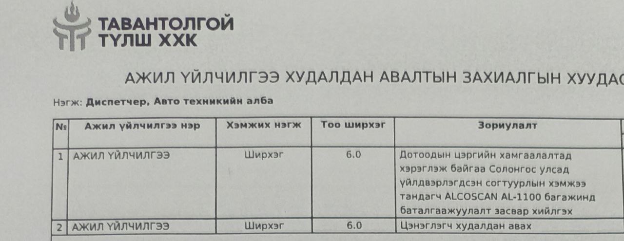 "Тавантолгой түлш ХХК нь хүснэгтэд заасан бараа, ажил, үйлчилгээг нийлүүлэх   хүсэлтэй аж ахуй нэгж байгууллагуудын хамтран ажиллах саналыг доор заасан   хугацаанд нээлттэй хүлээн авч байнаТа бүхэн дараах бараа, ажил үйлчилгээний мэдээлэлтэй танилцана уу.