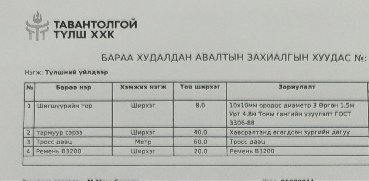 "Тавантолгой түлш” ХХК нь хүснэгтэд заасан бараа, ажил, үйлчилгээг нийлүүлэх хүсэлтэй аж ахуй нэгж байгууллагуудын хамтран ажиллах саналыг доор заасан хугацаанд нээлттэй хүлээн авч байна. Та бүхэн дараах бараа, ажил үйлчилгээний мэдээлэлтэй танилцана уу.
