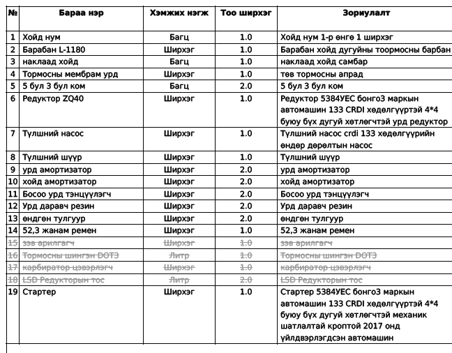 "Тавантолгой түлш” ХХК нь хүснэгтэд заасан бараа, ажил, үйлчилгээг нийлүүлэх хүсэлтэй аж ахуй нэгж байгууллагуудын хамтран ажиллах саналыг 3 хонгийн хугацаанд нээлттэй хүлээн авч байна. Та бүхэн дараах бараа, ажил үйлчилгээний мэдээлэлтэй танилцана уу.