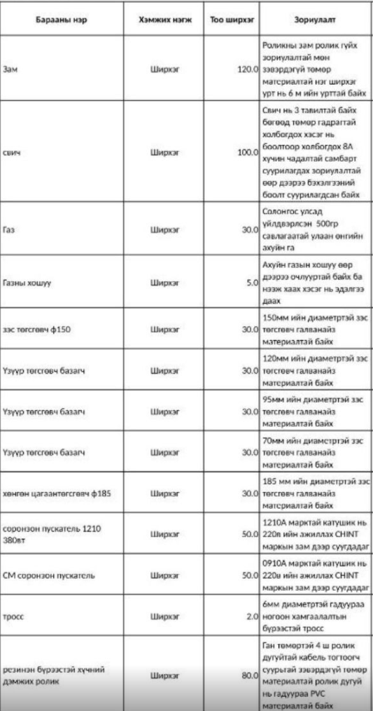 "Таван толгой түлш ХХК нь хүснэгтэд заасан бараа, ажил, үйлчилгээг нийлүүлэх   хүсэлтэй аж ахуй нэгж байгууллагуудын хамтран ажиллах саналыг 3 хонгийн  хугацаанд нээлттэй хүлээн авч байнаТа бүхэн дараах бараа, ажил үйлчилгээний мэдээлэлтэй танилцана уу.
