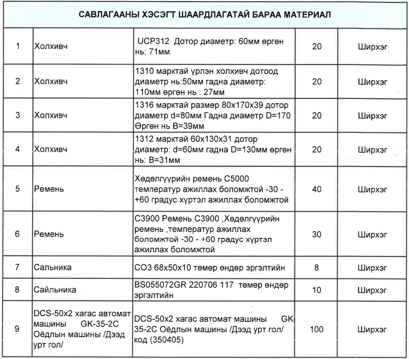 "Таван толгой түлш ХХК нь хүснэгтэд заасан бараа, ажил, үйлчилгээг нийлүүлэх   хүсэлтэй аж ахуй нэгж байгууллагуудын хамтран ажиллах саналыг 3 хонгийн  хугацаанд нээлттэй хүлээн авч байнаТа бүхэн дараах бараа, ажил үйлчилгээний мэдээлэлтэй танилцана уу.