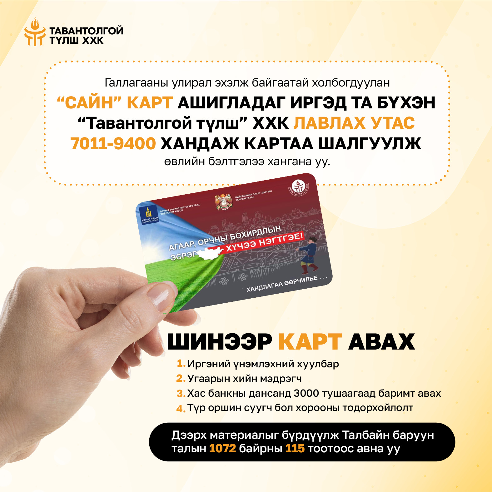Галлагааны улирал эхэлж байгаатай холбогдуулан “Сайн” карт ашигладаг иргэд Та бүхэн "Тавантолгой түлш" ХХК лавлах утас 7011-9400 рүү хандаж картаа шалгуулж өвлийн бэлтгэлээ хангана уу.