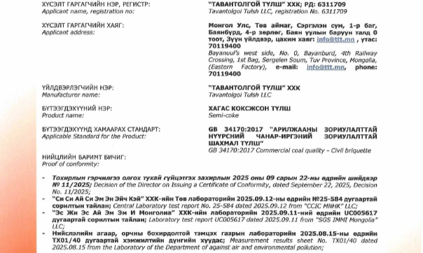 Нийслэлийн гэр хорооллын айл өрхүүд энэ өвөл хагас коксон шахмал түлшийг галлагаандаа хэрэглэнэ. Тэгвэл энэхүү хагас коксон шахмал түлш нь Монгол Улсын болон олон улсын стандарт шаардлагад бүрэн нийцсэнийг гэрчлэх "Тохирлын гэрчилгээ"-г холбогдох мэргэжлийн байгууллагаас олголоо.