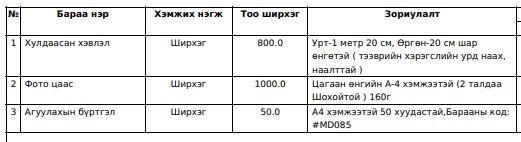 утас: "Таван толгой түлш” ХХК нь хүснэгтэд заасан бараа, ажил, үйлчилгээг нийлүүлэх хүсэлтэй аж ахуй нэгж байгууллагуудын хамтран ажиллах саналыг доор заасан хугацаанд нээлттэй хүлээн авч байна. Та бүхэн дараах бараа, ажил үйлчилгээний мэдээлэлтэй танилцана уу.