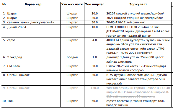 утас: "Таван толгой түлш” ХХК нь хүснэгтэд заасан бараа, ажил, үйлчилгээг нийлүүлэх хүсэлтэй аж ахуй нэгж байгууллагуудын хамтран ажиллах саналыг доор заасан хугацаанд нээлттэй хүлээн авч байна. Та бүхэн дараах бараа, ажил үйлчилгээний мэдээлэлтэй танилцана уу.