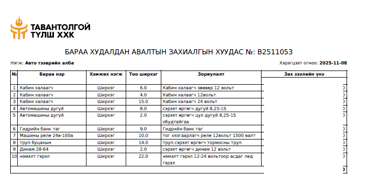 "Тавантолгой түлш” ХХК нь хүснэгтэд заасан бараа, ажил, үйлчилгээг нийлүүлэх хүсэлтэй аж ахуй нэгж байгууллагуудын хамтран ажиллах саналыг 3 хоногийн хугацаанд нээлттэй хүлээн авч байна. Та бүхэн дараах бараа, ажил үйлчилгээний мэдээлэлтэй танилцаж, үнийн санал болон холбогдох материалаа илгээхийг урьж байна.