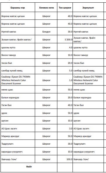 утас: "Таван толгой түлш” ХХК нь хүснэгтэд заасан бараа, ажил, үйлчилгээг нийлүүлэх хүсэлтэй аж ахуй нэгж байгууллагуудын хамтран ажиллах саналыг доор заасан хугацаанд нээлттэй хүлээн авч байна. Та бүхэн дараах бараа, ажил үйлчилгээний мэдээлэлтэй танилцана уу.