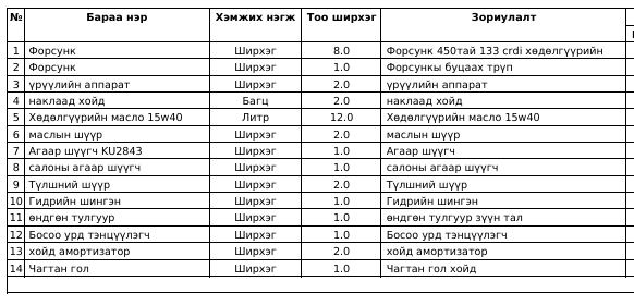 утас: "Таван толгой түлш” ХХК нь хүснэгтэд заасан бараа, ажил, үйлчилгээг нийлүүлэх хүсэлтэй аж ахуй нэгж байгууллагуудын хамтран ажиллах саналыг доор заасан хугацаанд нээлттэй хүлээн авч байна. Та бүхэн дараах бараа, ажил үйлчилгээний мэдээлэлтэй танилцана уу.