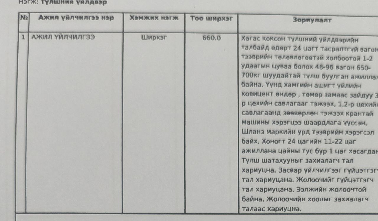"Тавантолгой түлш” ХХК нь хүснэгтэд заасан бараа, ажил, үйлчилгээг нийлүүлэх хүсэлтэй аж ахуй нэгж байгууллагуудын хамтран ажиллах саналыг доор заасан хугацаанд нээлттэй хүлээн авч байна. Та бүхэн дараах бараа, ажил үйлчилгээний мэдээлэлтэй танилцана уу.