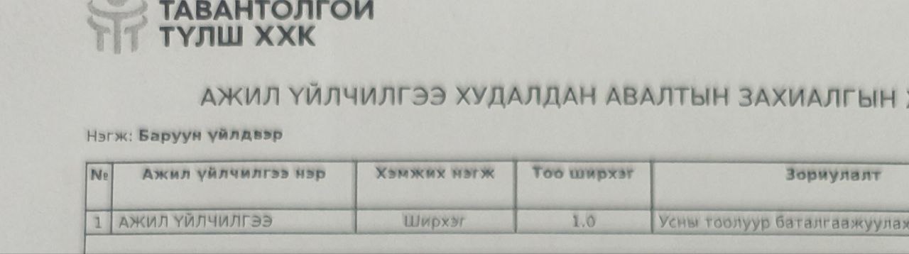 "Тавантолгой түлш” ХХК нь хүснэгтэд заасан бараа, ажил, үйлчилгээг нийлүүлэх хүсэлтэй аж ахуй нэгж байгууллагуудын хамтран ажиллах саналыг доор заасан хугацаанд нээлттэй хүлээн авч байна. Та бүхэн дараах бараа, ажил үйлчилгээний мэдээлэлтэй танилцана уу.