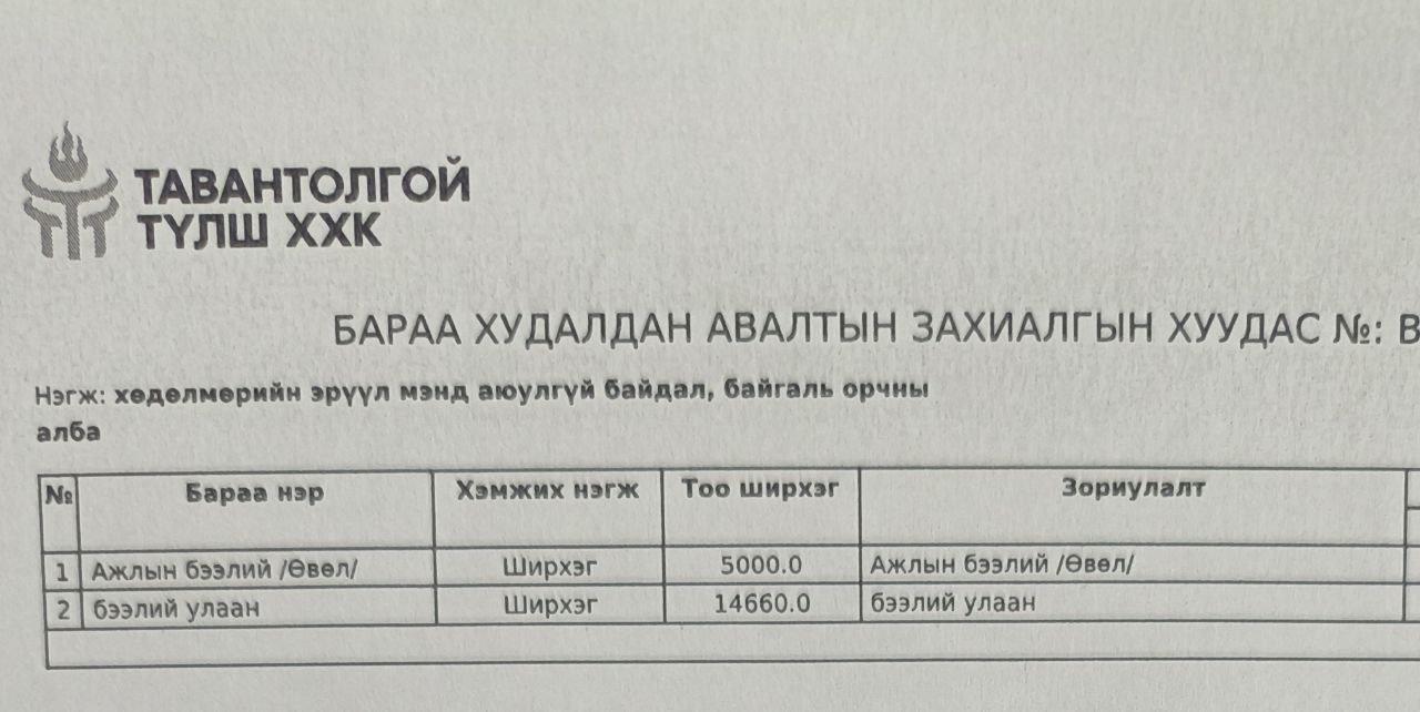 "Тавантолгой түлш” ХХК нь хүснэгтэд заасан бараа, ажил, үйлчилгээг нийлүүлэх хүсэлтэй аж ахуй нэгж байгууллагуудын хамтран ажиллах саналыг дээрх заасан хугацаанд нээлттэй хүлээн авч байна. Та бүхэн дээрэх бараа, ажил үйлчилгээний мэдээлэлтэй танилцана уу.